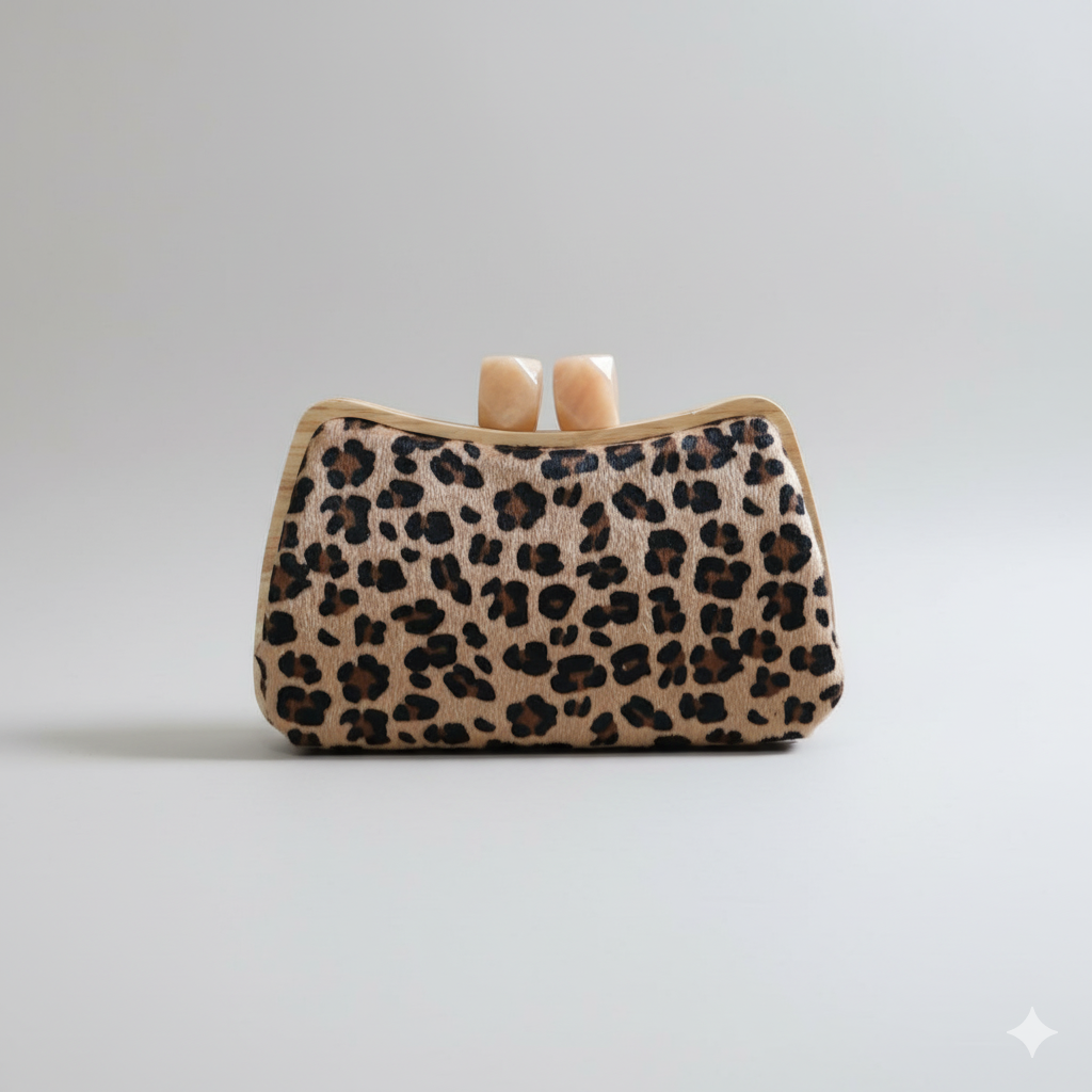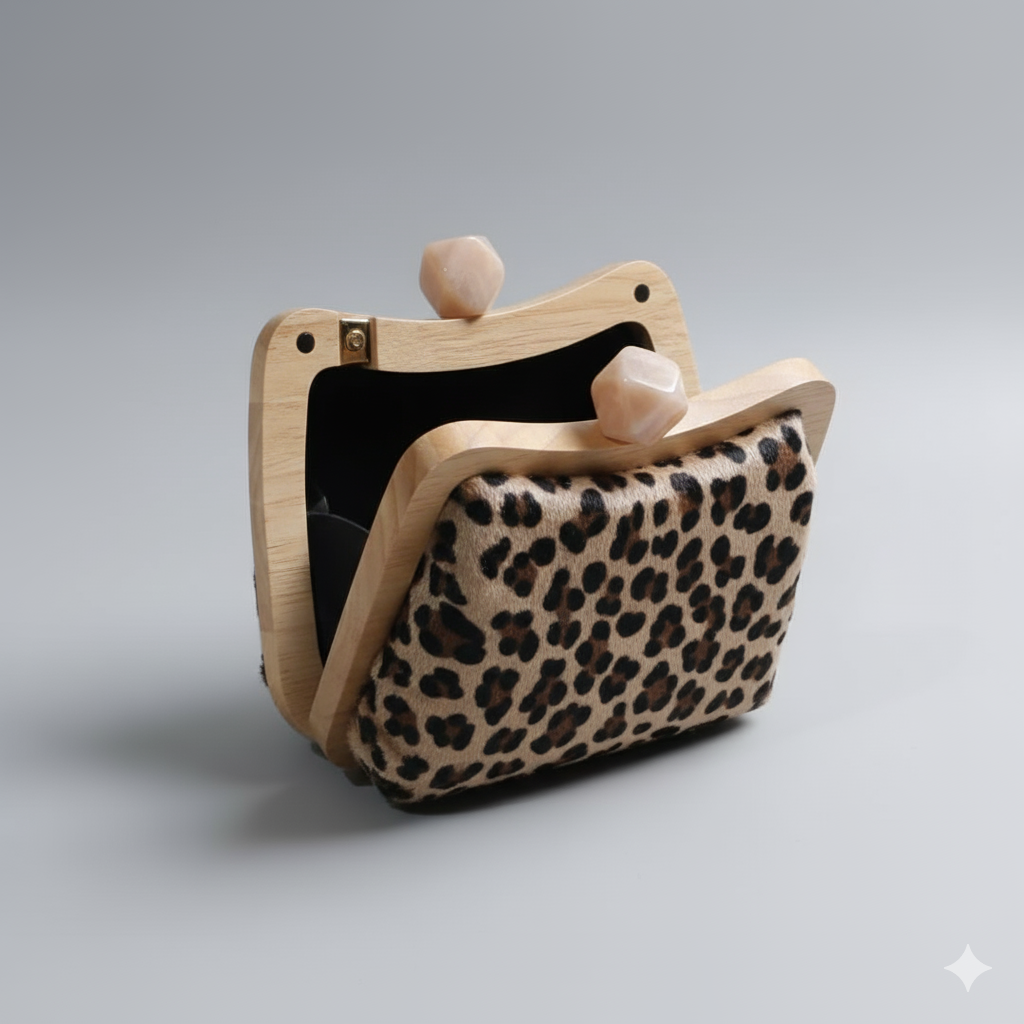 A bold statement piece blending natural elegance with wild charm. Crafted with a smooth wooden frame and a rich leopard-print body, this clutch features hand-cut geometric clasp knobs and a soft lined interior—perfect for carrying your essentials in style. Lightweight, chic, and effortlessly eye-catching.